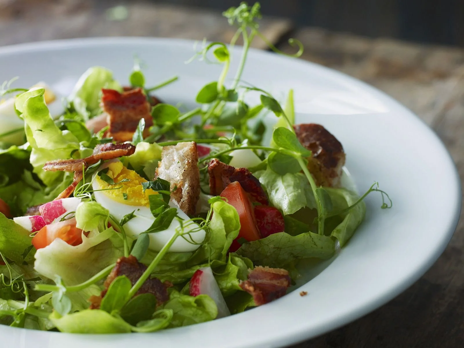 3 Divide the mixed greens between 2 plates and dress with oil and balsamic vinegar, then top with the hemp seeds. Share the cooked bacon and eggs between the plates.